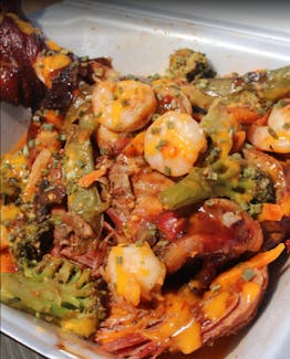 We serve a variety of food here at J & B's Twizted Barbecue. Our menu offers Turkey Leg, Smoked Turkey, Full Rack, Turkey Leg Combo, Loaded Potato Pork and more! We are located on West State Hwy 18. Order online for carryout!